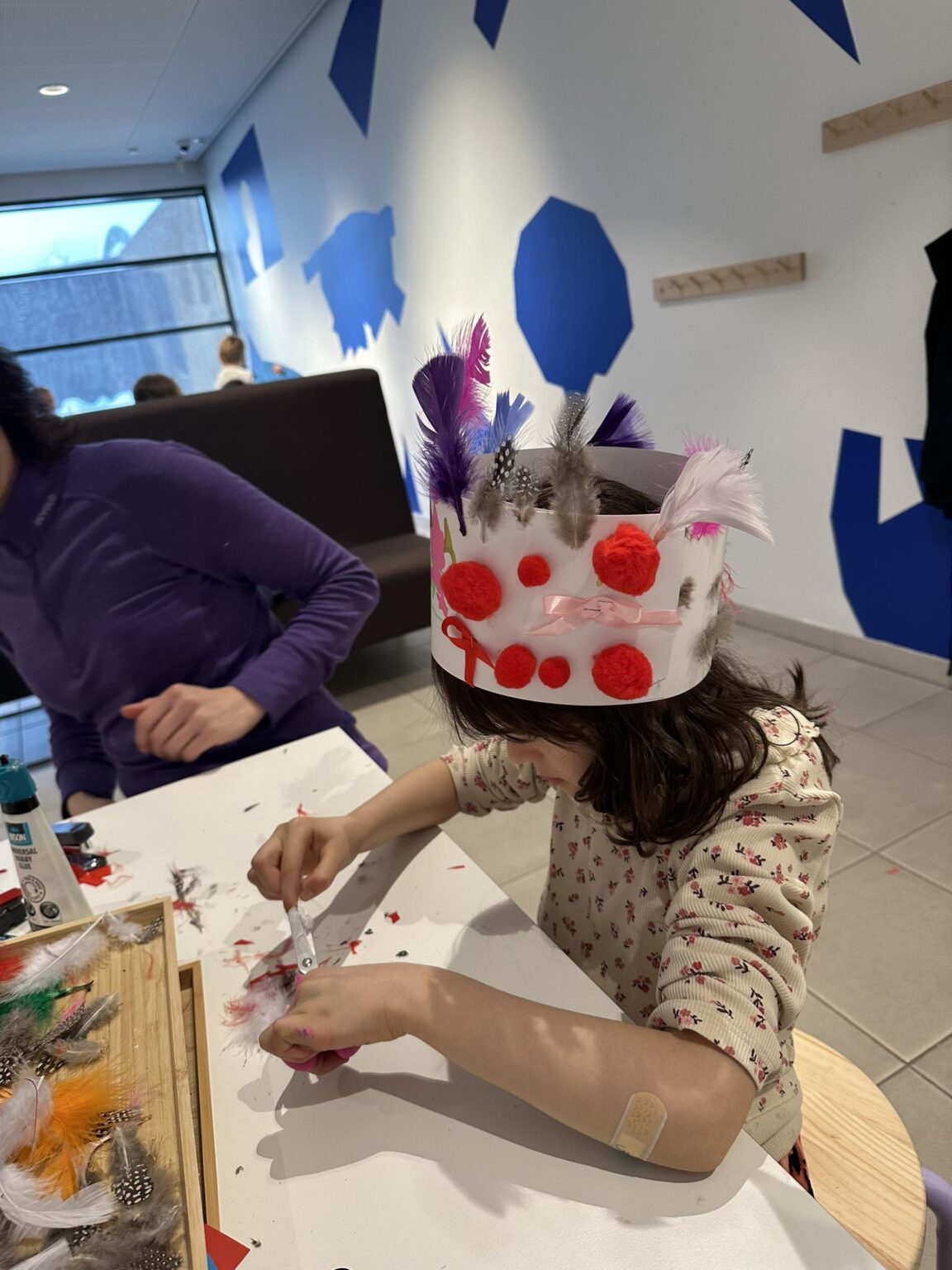 Dúskar, fjaðrir, slaufur og strá. Búum saman til skemmtilegar kórónur úr litríkum og skemmtilegum efnivið.Allt efni verður á staðnum og aðgangur er ókeypis.