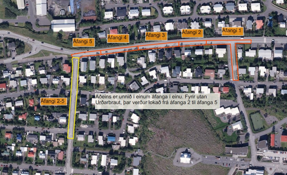 Verkið verður unnið í áföngum og byrjað við Hábraut og unnið þaðan smám saman að Urðarbraut. Brýr fyrir gangandi og/eða ökutæki verða settar upp við innkeyrslur þar sem unnið er hverju sinni og aðgengi að húsum tryggt allan tímann.