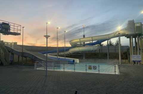 Endurnýjun á rennibrautum í Sundlaug Kópavogs er lokið og því hægt að nota þær á nýjan leik.