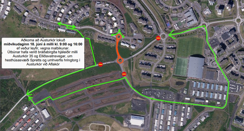 Miðvikudaginn 18. júní frá kl. 9:00 til 16:00 er áformað að malbika Austurkór milli Vatnsendavegar og hringtorgs við Austurkór auk helmings á hringtorgi á Vatnsendavegi við Austurkór ef veður leyfir. Lokanir verða Vatnsendavegi við Tröllakór og á Elliðavatnsvegi auk á milli hringtorga á Vatnsendavegi og Austurkór. Hjáleiðir verða um bráðabirgðaleiðir milli Austurkór 35 og Elliðavatnsvegar og um hesthúsasvæði Spretts, Garðabæjar megin. Einnig verður hægt að fara umhverfis framkvæmdasvæði á hringtorgi við Aflakór á bráðabirgðahjáleið. Mikilvægt er að ökumenn hagi akstri sínum á hjáleiðunum í samræmi við aðstæður og sýni fulla tillitssemi gagnvart öðrum vegfarendum sem þar gætu farið um. Gangandi og hjólandi þurfa að vera viðbúnir að ökutæki munu þurfa að fara um gönguleið og sýni fulla aðgát.
