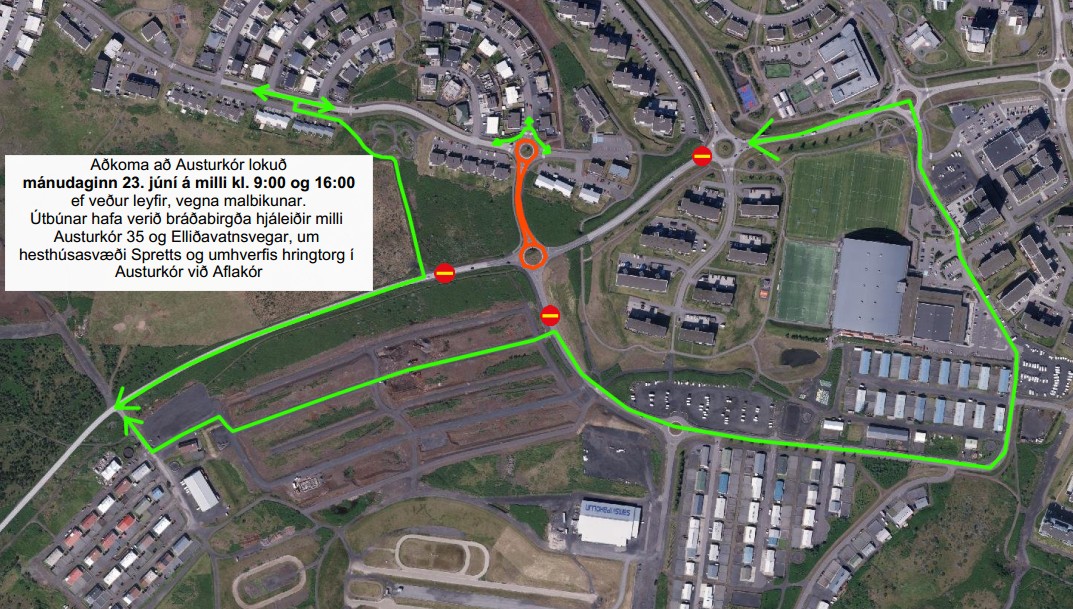 Mánudaginn 23. júní frá kl. 9:00 til 16:00 er áformað að malbika Austurkór milli Vatnsendavegar og hringtorgs við Austurkór auk helmings á hringtorgi á Vatnsendavegi við Austurkór ef veður leyfir. Lokanir verða Vatnsendavegi við Tröllakór og á Elliðavatnsvegi auk á milli hringtorga á Vatnsendavegi og Austurkór. Hjáleiðir verða um bráðabirgðaleiðir milli Austurkór 35 og Elliðavatnsvegar og um hesthúsasvæði Spretts, Garðabæjar megin. Einnig verður hægt að fara umhverfis framkvæmdasvæði á hringtorgi við Aflakór á bráðabirgðahjáleið. Mikilvægt er að ökumenn hagi akstri sínum á hjáleiðunum í samræmi við aðstæður og sýni fulla tillitssemi gagnvart öðrum vegfarendum sem þar gætu farið um. Gangandi og hjólandi þurfa að vera viðbúnir að ökutæki munu þurfa að fara um gönguleið og sýni fulla aðgát.