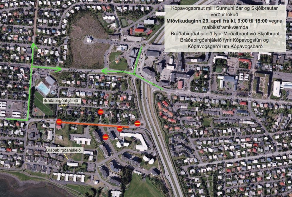 Miðvikudaginn 29. apríl frá kl. 9:00 til um það bil 15:00 er áætlað að endurnýja malbik á Kópavogsbraut á milli Sunnuhlíðar og Skjólbrautar ef veður leyfir. Lokað verður fyrir umferð við hringtorg á Kópavogsbraut við Sunnuhlíð og á gatnamótum Kópavogsbrautar og Skjólbrautar. Útbúnar verða bráðabirgðahjáleiðir fyrir Meðalbraut frá Skjólbraut og fyrir Kópavogstún og Kópavogsgerði um Kópavogsbarð. Vinsamlegast athugið að aka um hjáleiðirnar með gætni og stilla hraða í hóf.