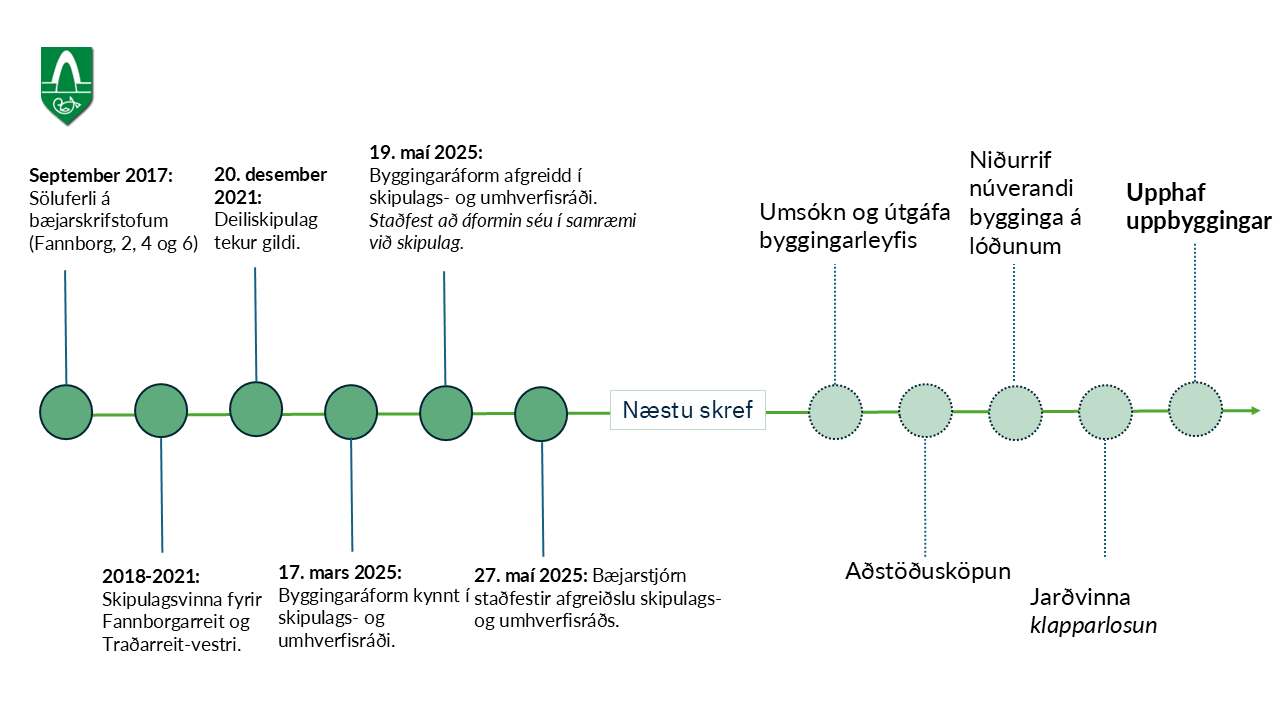 Deiliskipulag svæðisins tók gildi árið 2021 en drög að byggingaráformum voru staðfest í bæjarstjórn í maí 2025.